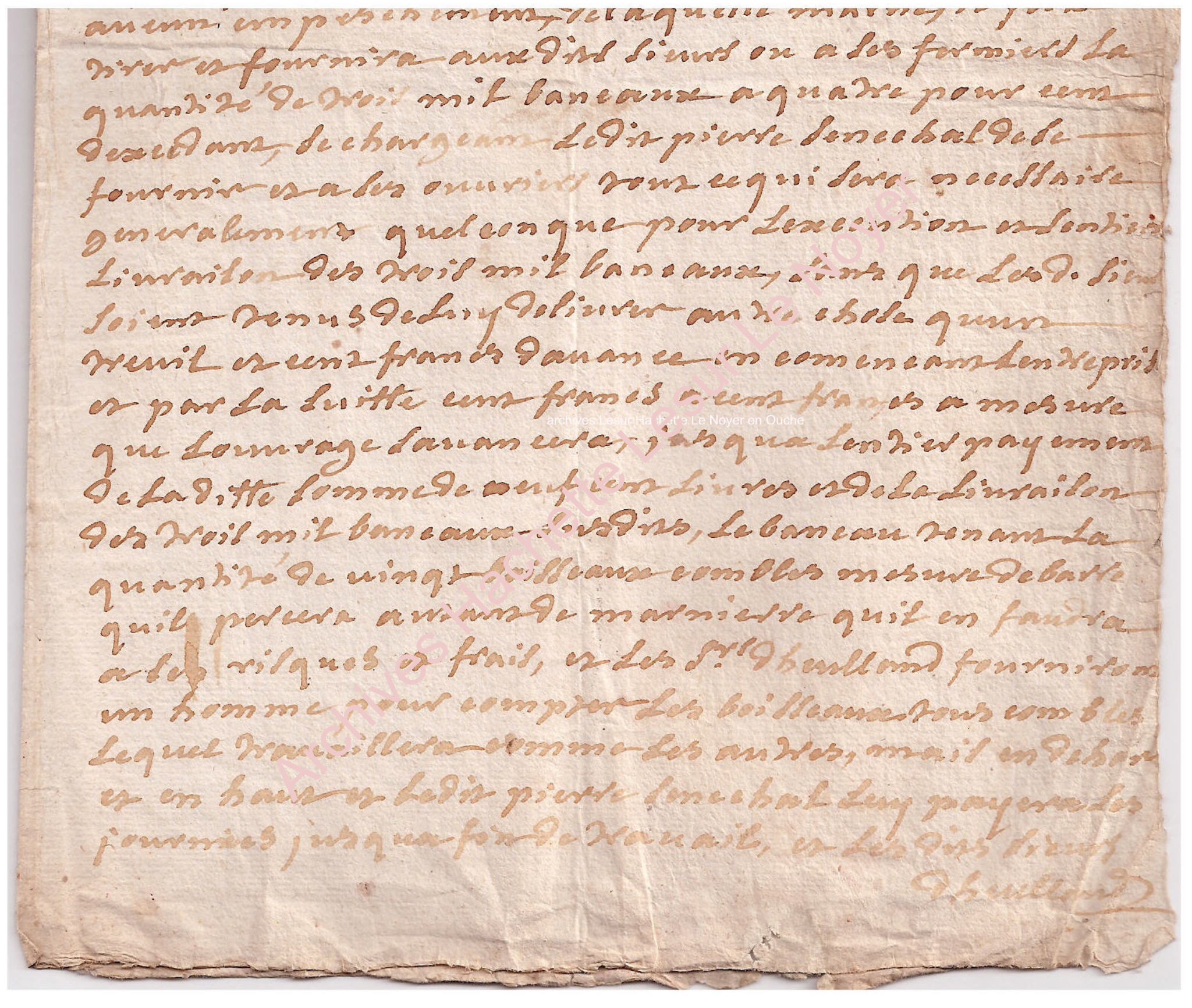 + .../... sans que les dits sieurs soient tenus de leur délivrer autre chose qu’un treuil et cent francs d’avance en commençant l’entreprise et par la suite cent francs à cent francs à mesure que l’ouvrage avancera jusqu’à l’entier payement de la dite somme de neuf cent livres et de la livraison des trois mil baneaux sus dits, le baneau tenant la quantité de vingt boisseaux combles mesure de ……….. …….…..qu’il percera autant de marnière qu’il en faudra à ses risques et frais,