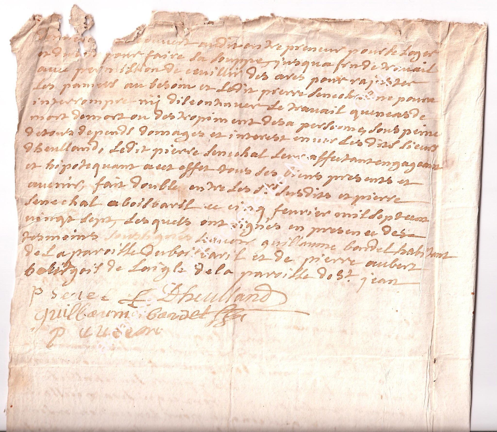 et de Pierre Sénéchal, maître marneron demeurant sur la paroisse du Long Essard de l’autre part sommes convenus des conditions et marcheds suivants, savoir : que nous sieurs Dheulland frères sus dits, donnerons au dit Pierre Sénéchal maitre marneron la somme de neuf cent livres ; moyennant qu’il ouvrira deux marnières pour les quatre fermes du Bois Baril, une pour celle des maiteries et celle du manoir et une pour celle du vieux jardin et celle de la fortierre.