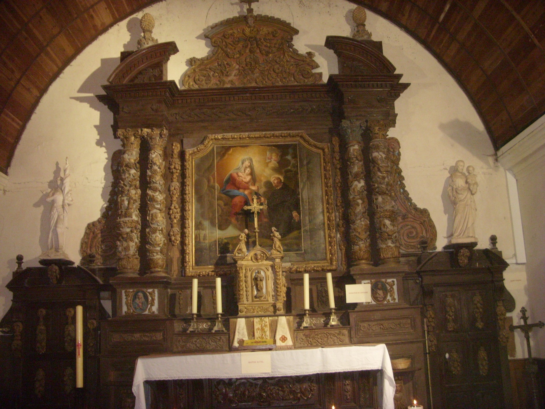 La pièce principale du mobilier est le maître-autel qui comporte un large fronton circulaire brisé porté par quatre colonnes torses couvertes de vignes avec oiseaux et escargots. Le tabernacle est à trois pans en bois doré.