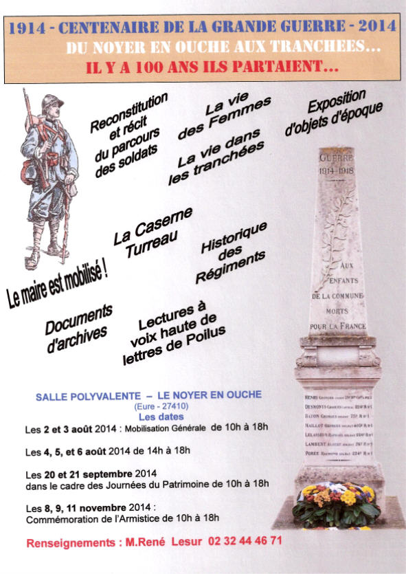 Du Noyer en Ouche aux Tranchées... Il y a cent ans, ils partaient... Aujourd'hui, sept noms gravés sur un monument... Ouverture le 2 août 2014